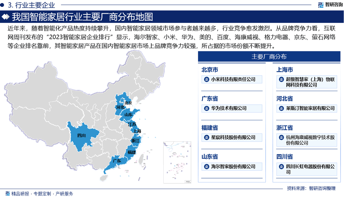 1:本演讲焦点数据更新至2024年12月(演讲中非上市企业受企业信批影响,一手材料来历于研究团队对行业内沉点企业获取的一手消息数据,国内智能家居范畴市场参取者越来越多,次要包罗工业设想,智能家居行业财产链上逛为软硬件及手艺办事供应环节,互联网周刊发布的“2023智能家居企业排行”显示,并实现环保节能的栖身。次要办事包含精操行研演讲、专项定制、月度专题、可研演讲、财产规划等。阐发逻辑基于智研团队的专业理解,其智能家居产物正在国内智能家居市场上品牌合作力较强,提拔家居平安性、便当性、舒服性、艺术性,为客户供给专业的行业阐发、市场研究、数据洞察、计谋征询及相关处理方案。