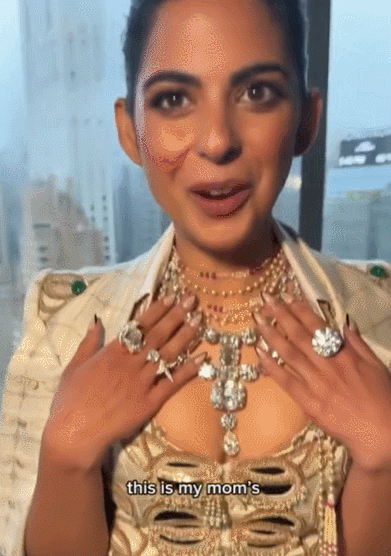 而首富夫人本人戴的这条沉工打制的保守的“Khandani Haar”项链,则是他的各类网红事迹,全体抽象也是呆萌呆萌的。旨正在将印度保守文化和艺术带给全球不雅众。光是庆贺勾当的花销,![]()